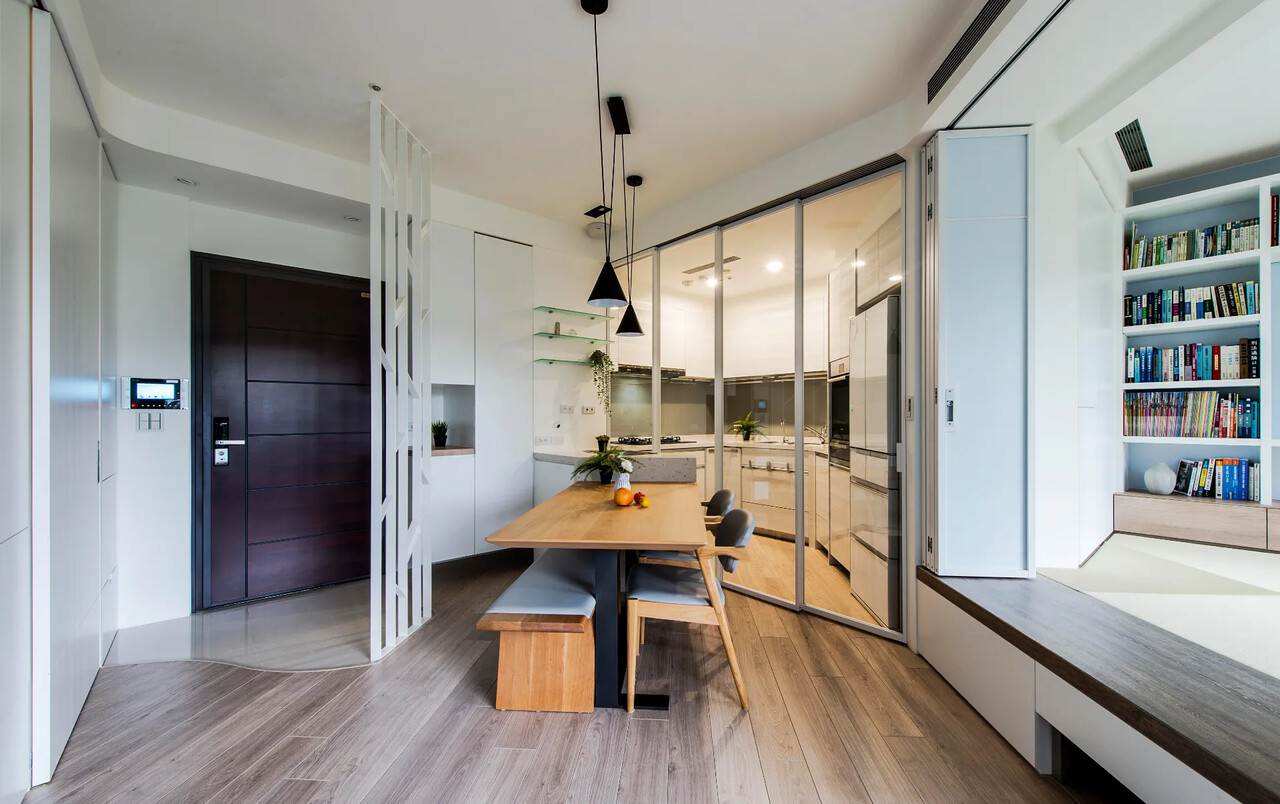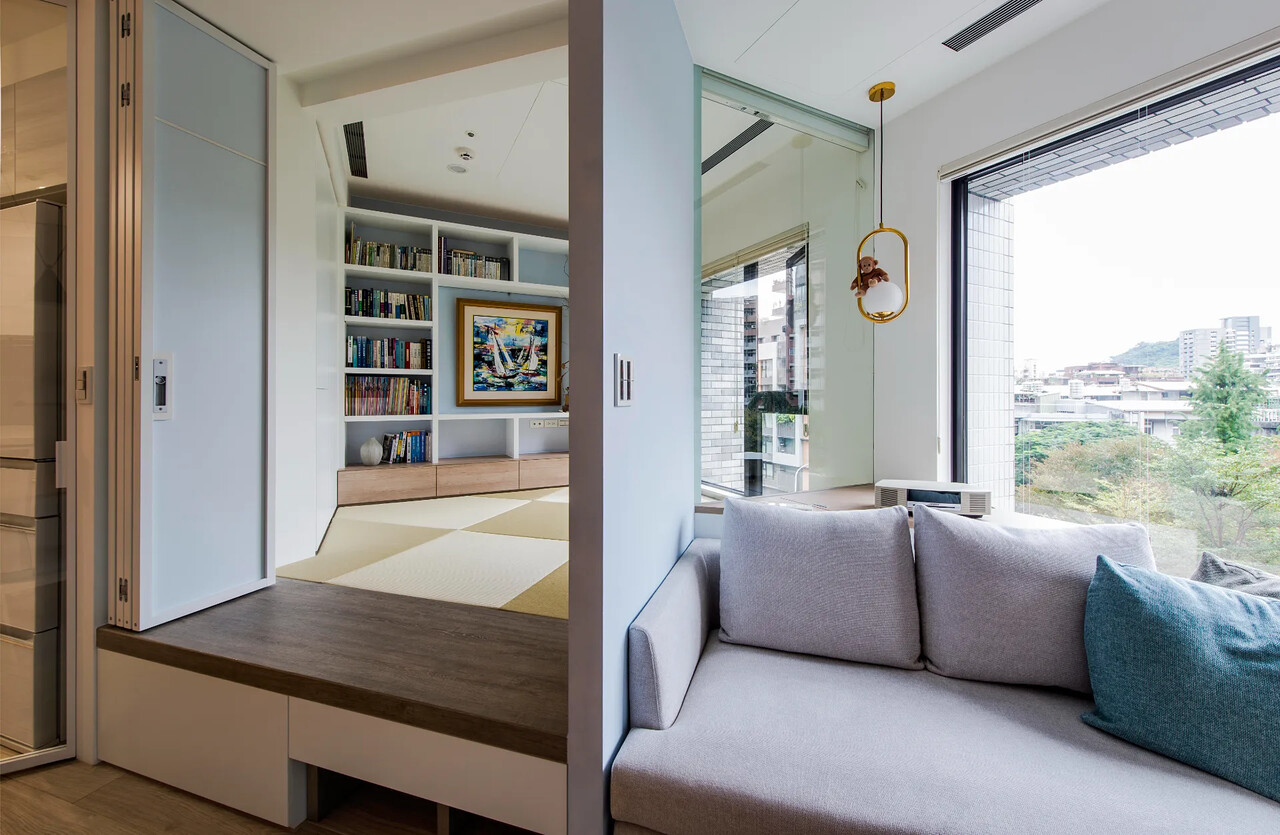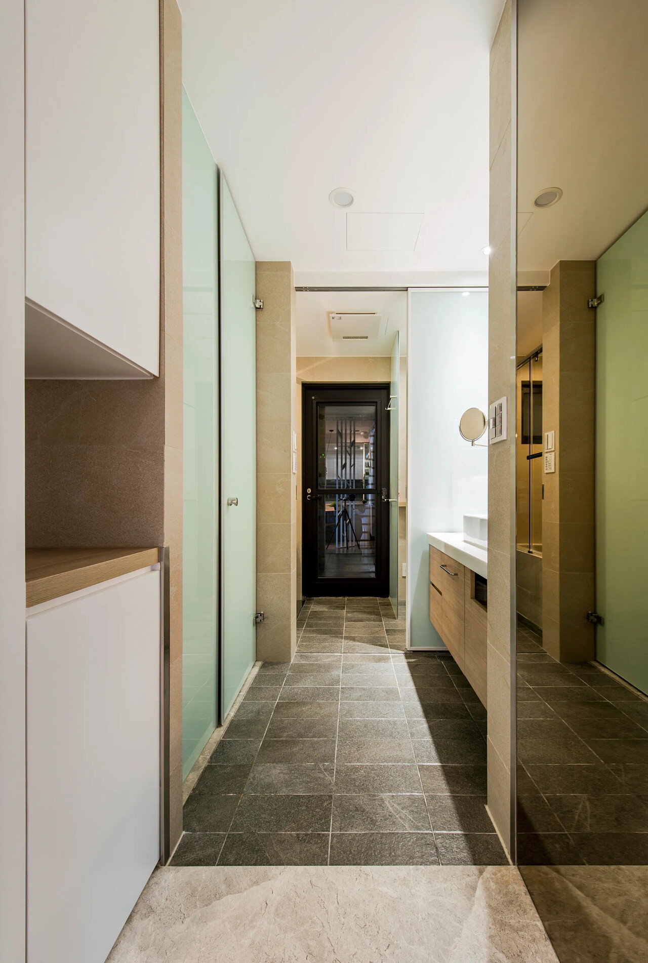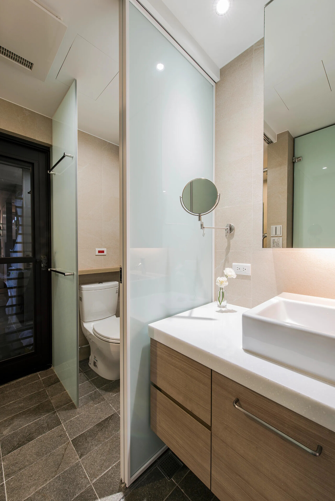 將洗手台、廁所和淋浴空間的機能獨立分離,大幅提升使用效率;並解決廁所在使用中就無法通到後陽台的問題