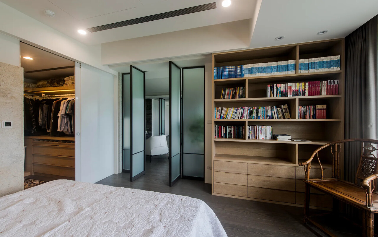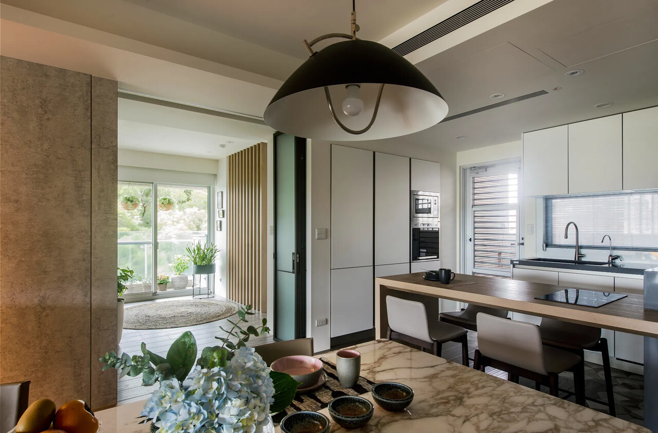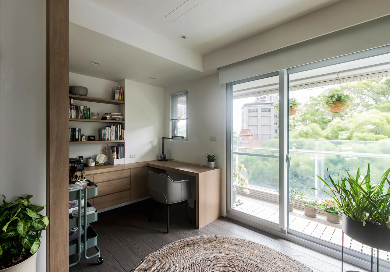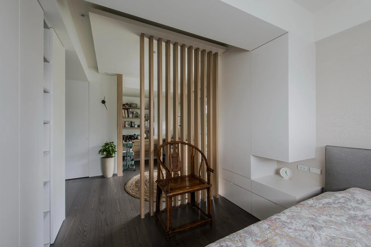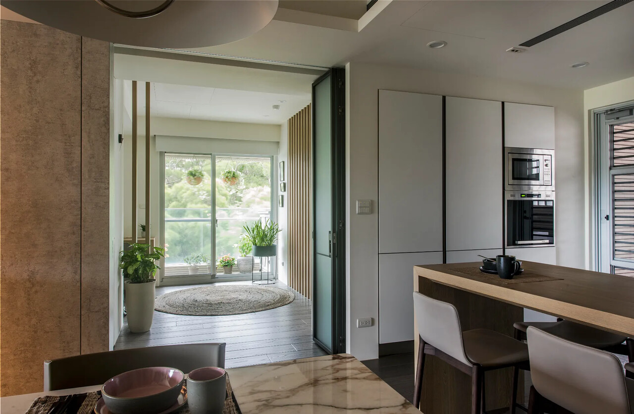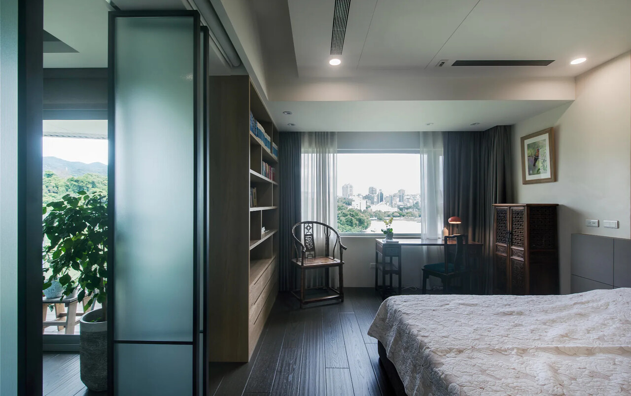 女主人的臥房與工作區安排在從公領域無法一眼看透的兩邊,開門時,可以使側陽台的景致與餐廳做連結,卻不會對隱私有影響