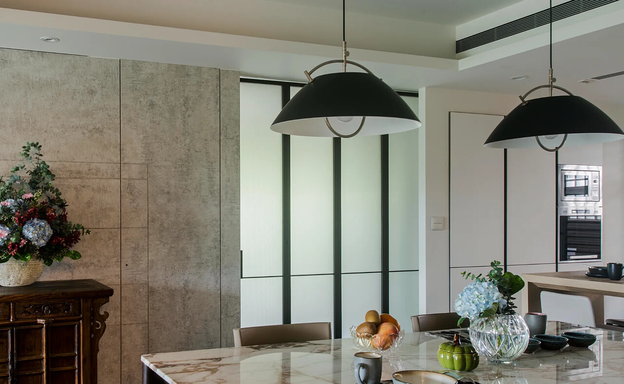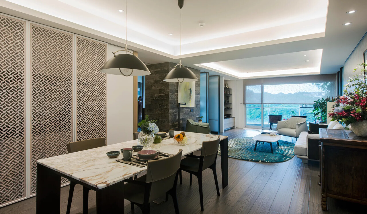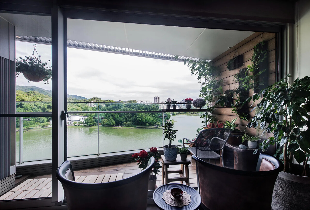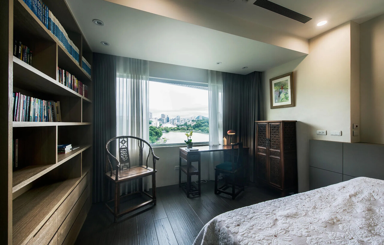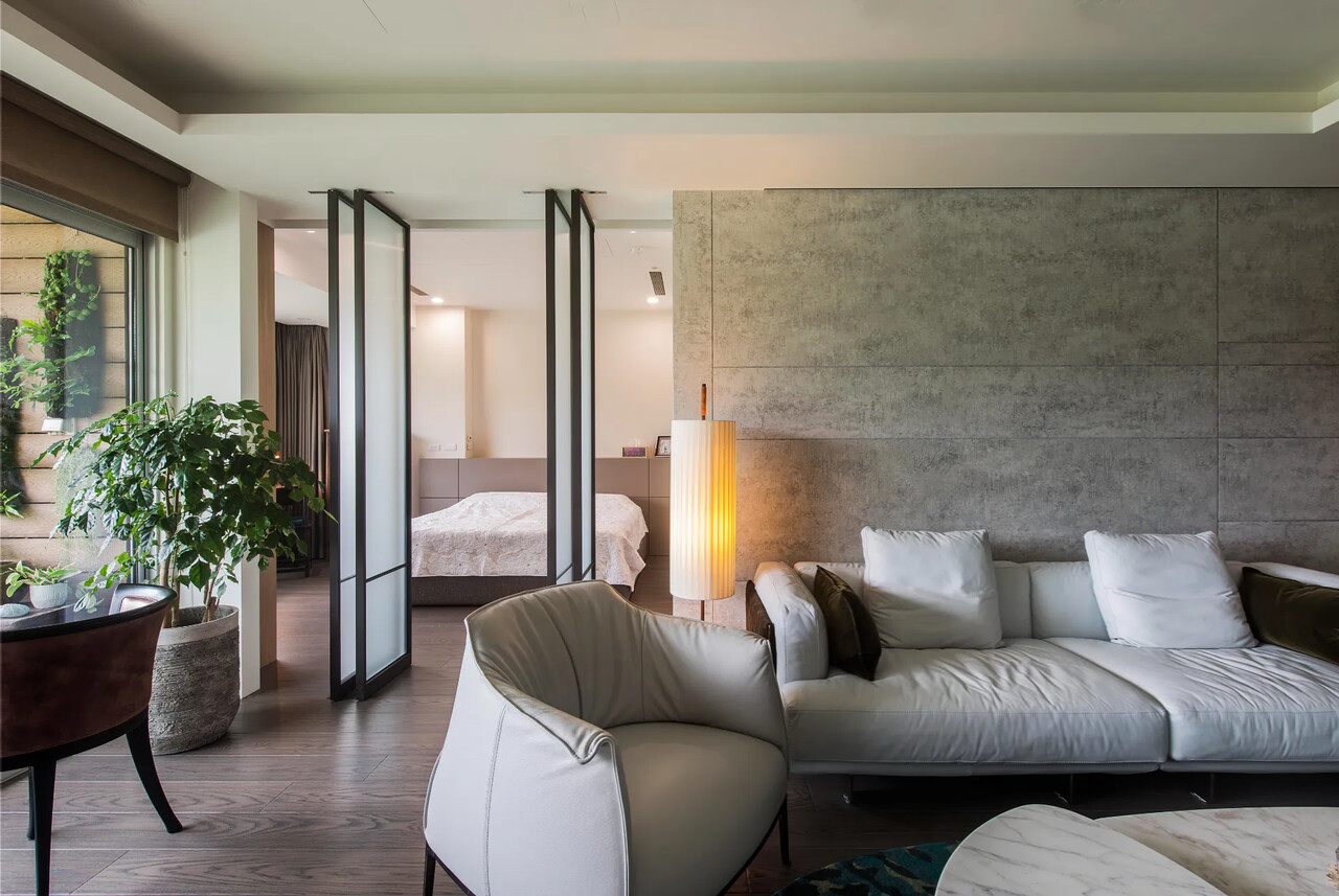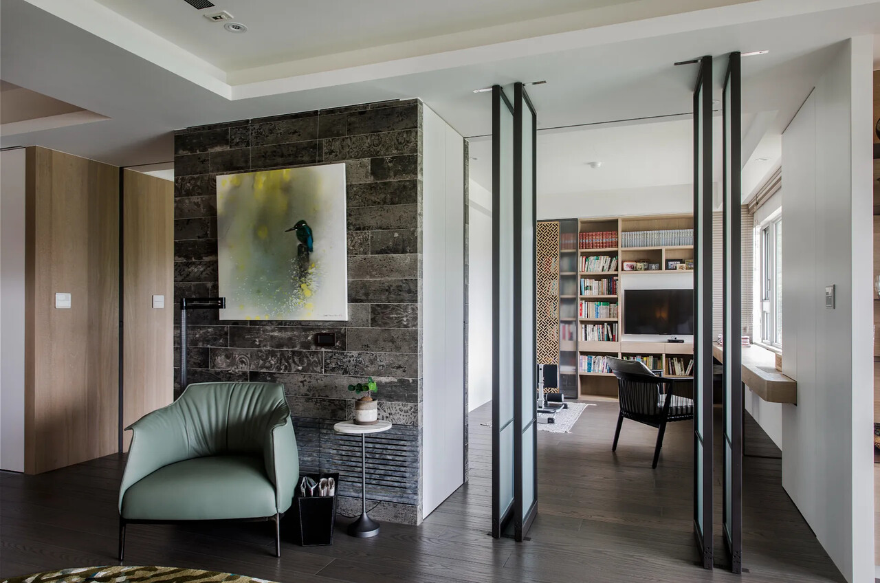 女主人的臥房與工作區安排在從公領域無法一眼看透的兩邊,開門時,可以使側陽台的景致與餐廳做連結,卻不會對隱私有影響