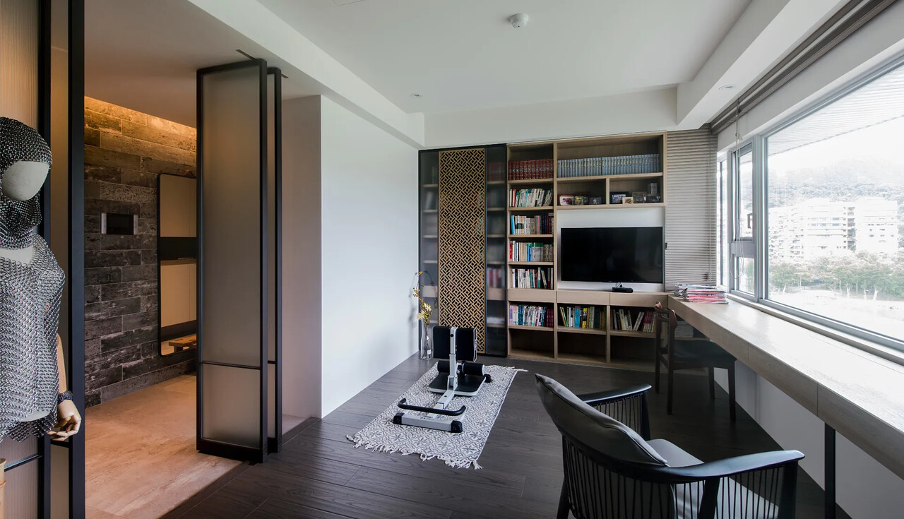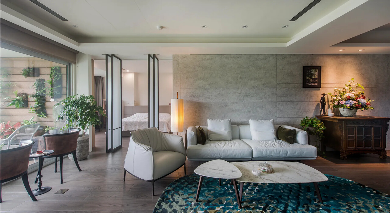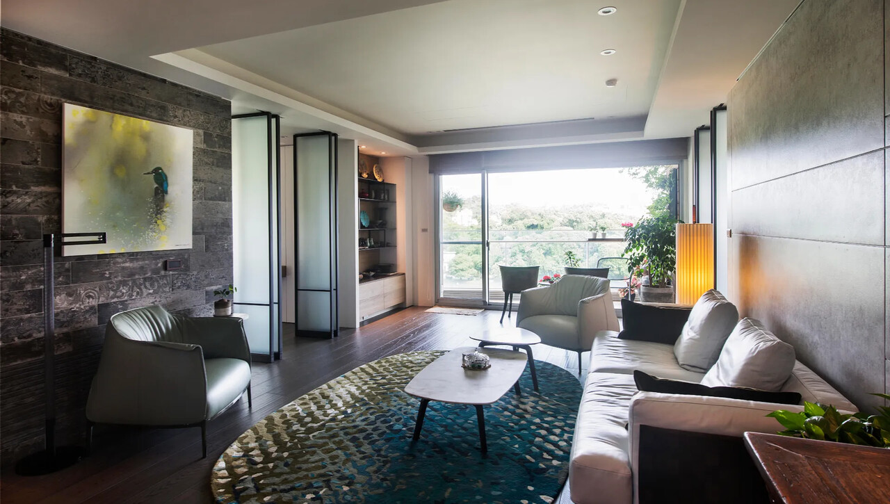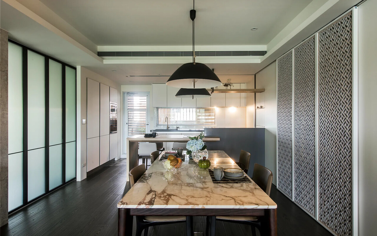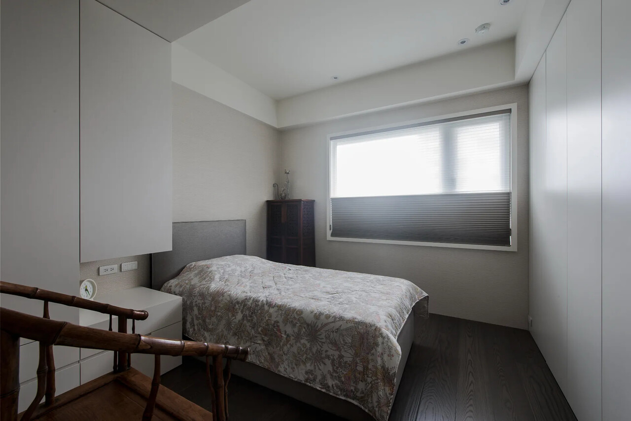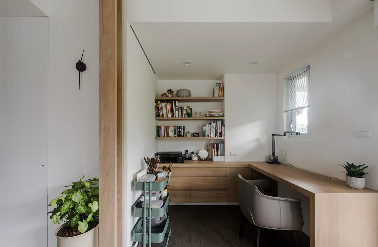 女主人的臥房與工作區安排在從公領域無法一眼看透的兩邊,開門時,可以使側陽台的景致與餐廳做連結,卻不會對隱私有影響