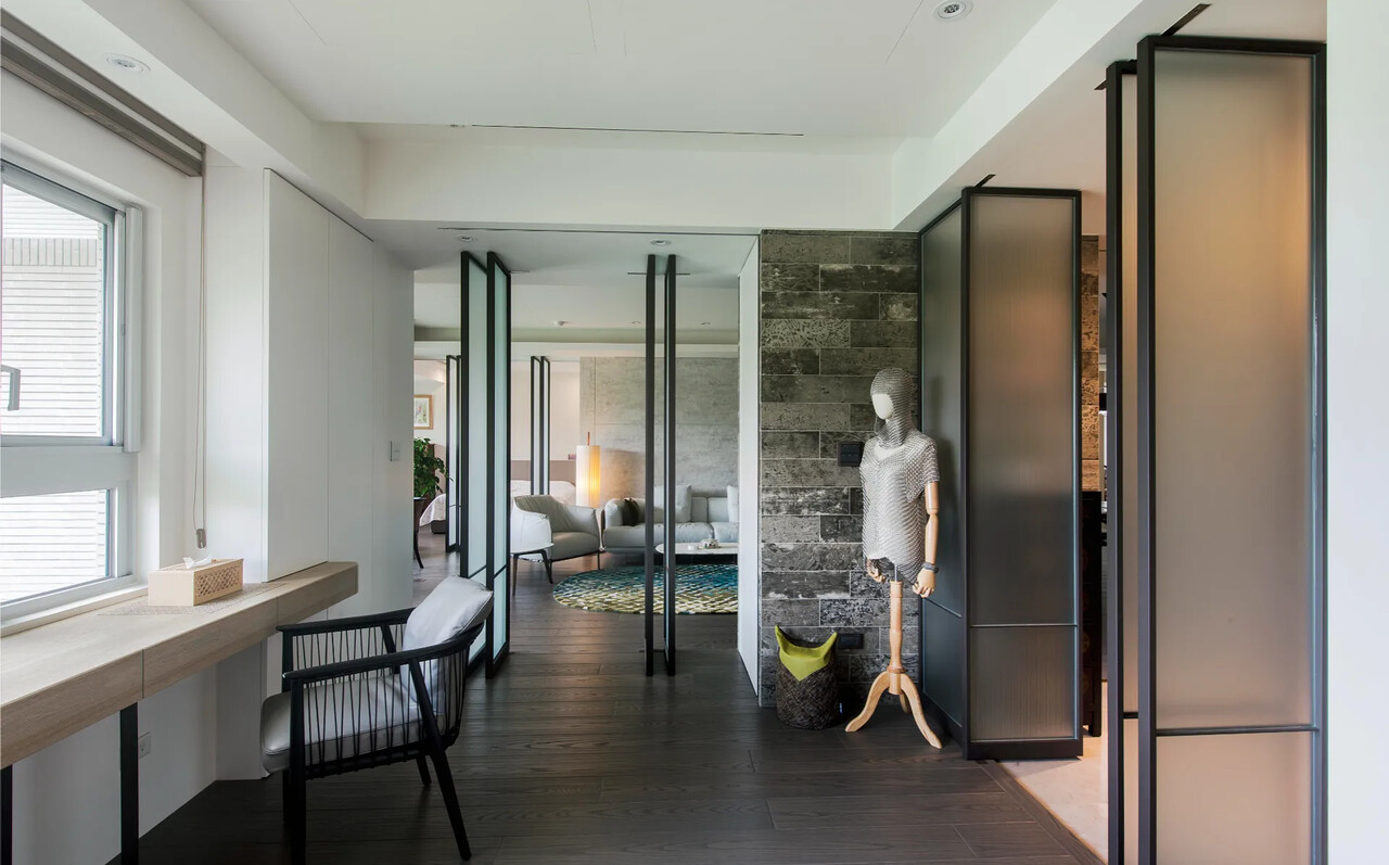 利用旋轉門取代牆面來界定空間範圍,門打開時即是客廳的延伸,使得公私領域,創造出既保有隱私又通透的空間;讓原本狹隘的玄關瞬間明亮寬敞了起來