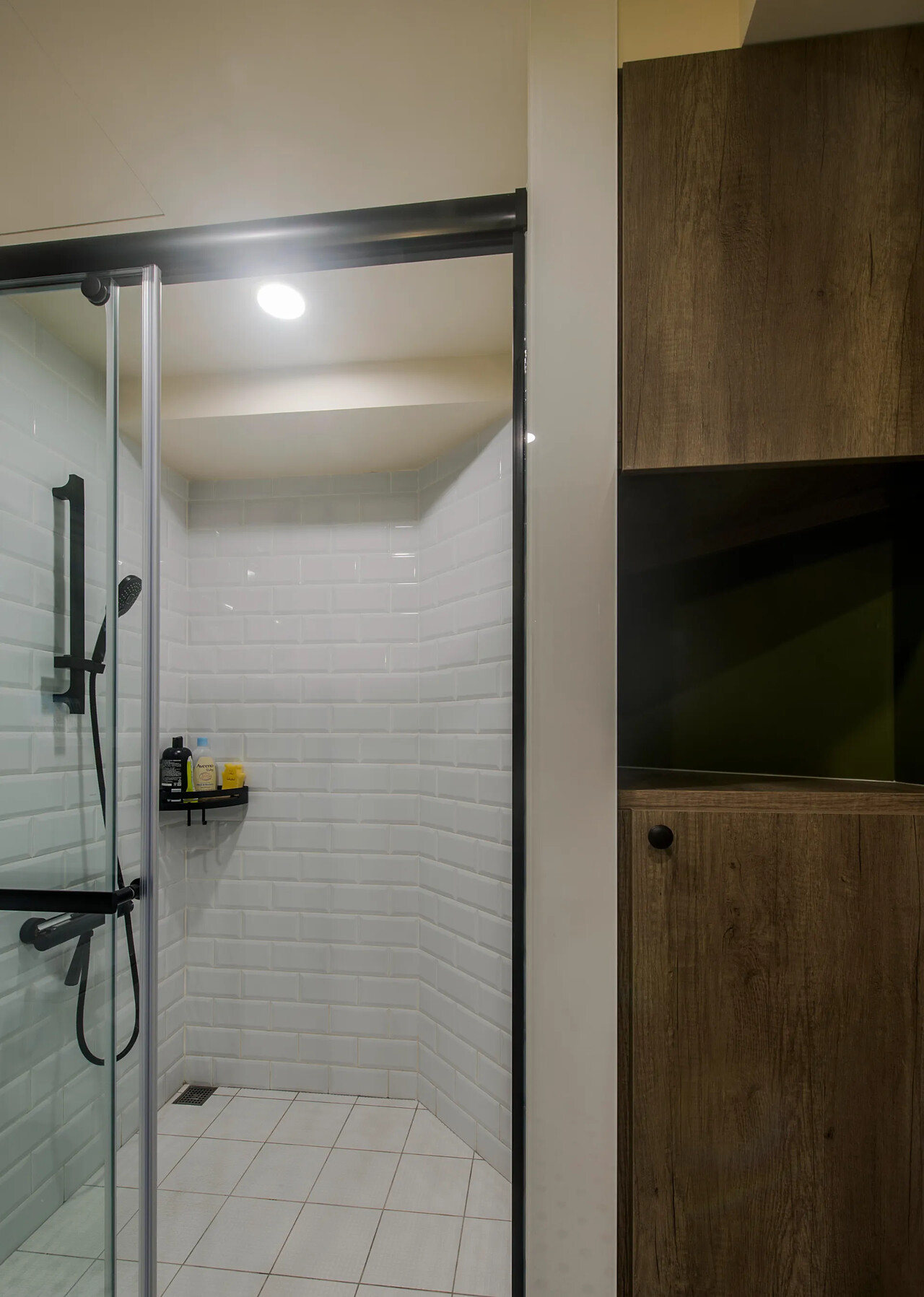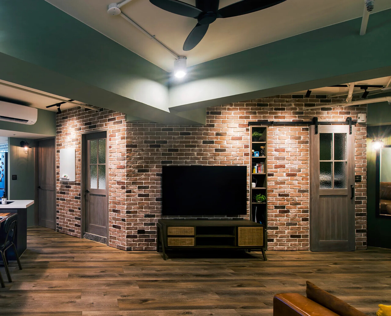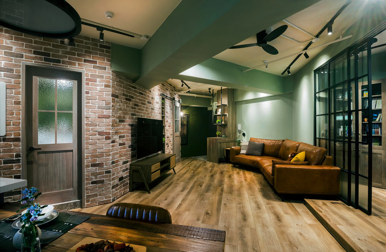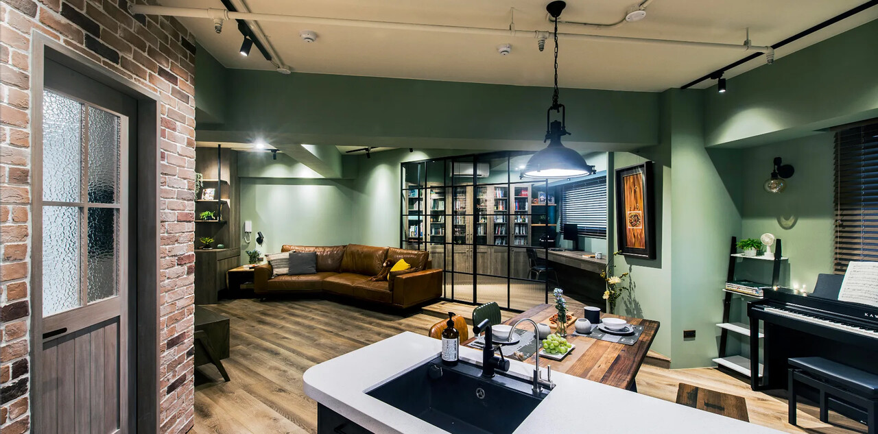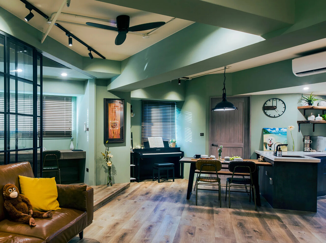 利用斜角設計的技巧,同時連結客廳、餐廳及廚房,打造出公領域之間良好的互動關係